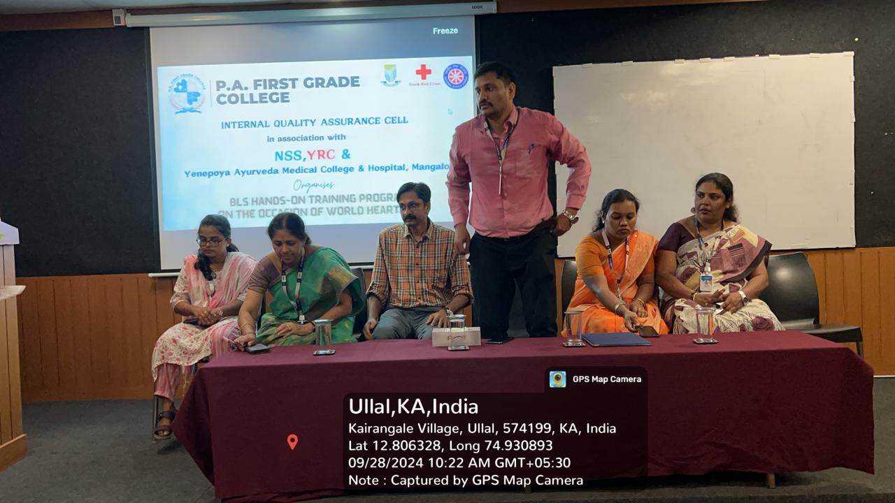 Mangalore, 28 Septmber 2024: the Internal Quality Assurance Cell (IQAC). in collaboration with NSS, , YRS and Yenepoya Ayurveda Medical College & Hospital, Mangalore, organized a Basic Life Support (BLS) Hands-On Training Program in the Multipurpose Hall to observe World Health Day. The event also aligned with World Heart Day, highlighting the theme “Use Heart for Action,” emphasizing the importance of heart health and timely intervention.