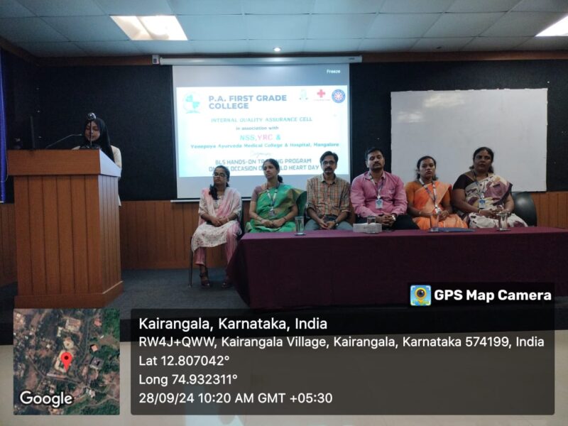 Mangalore, 28 Septmber 2024: the Internal Quality Assurance Cell (IQAC). in collaboration with NSS, , YRS and Yenepoya Ayurveda Medical College & Hospital, Mangalore, organized a Basic Life Support (BLS) Hands-On Training Program in the Multipurpose Hall to observe World Health Day. The event also aligned with World Heart Day, highlighting the theme “Use Heart for Action,” emphasizing the importance of heart health and timely intervention.