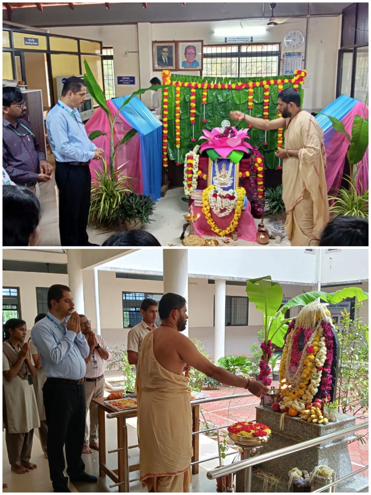 ಕುಂದಾಪುರ, ಅಕ್ಟೋಬರ್ 09, 2024: ಡಾ| ಬಿ. ಬಿ. ಹೆಗ್ಡೆ ಪ್ರಥಮ ದರ್ಜೆ ಕಾಲೇಜಿನ ಪ್ರಾಂಗಣದಲ್ಲಿರುವ ಸರಸ್ವತಿ ದೇವರ ಮೂರ್ತಿಗೆ ಪೂಜೆ ಸಲ್ಲಿಸಿ, ಗ್ರಂಥಾಲಯದಲ್ಲಿ ಶಾರದಾ ಪೂಜೆ ಕಾರ್ಯಕ್ರಮವನ್ನು ಭಜನಾ ಕೀರ್ತನೆಯ ಮೂಲಕ ಅಕ್ಟೋಬರ್ 09ರಂದು ಆಚರಿಸಲಾಯಿತು. ಕಾಲೇಜಿನ ಗಣಕ ವಿಜ್ಞಾನ ವಿಭಾಗದ ಸಹ ಪ್ರಾಧ್ಯಾಪಕ ಶ್ರೀ ಗಿರಿರಾಜ್ ಭಟ್ ಪೂಜೆ ನೆರವೇರಿಸಿದರು.
