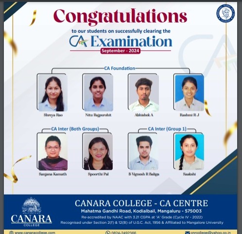 The students have achieved remarkable results in various levels of the Chartered Accountancy courses, reflecting their dedication, hard work, and the institution’s commitment to academic excellence. Canara College, which is re-accredited by NAAC with a CGPA of 3.21 at ‘A’ Grade (Cycle IV – 2022), continues to provide high-quality education and training in the field of commerce and accounting.