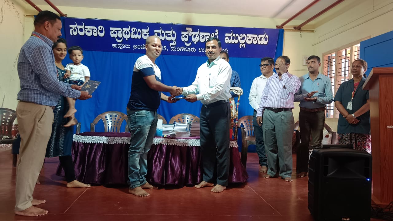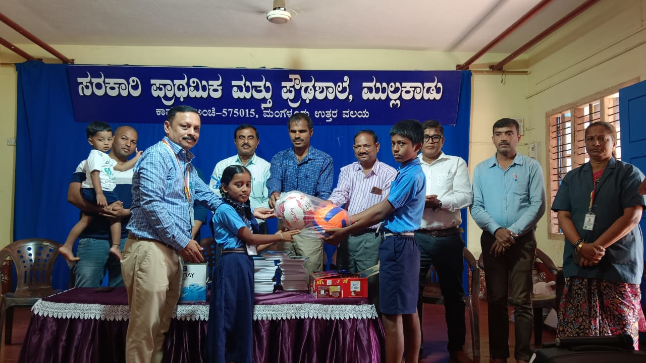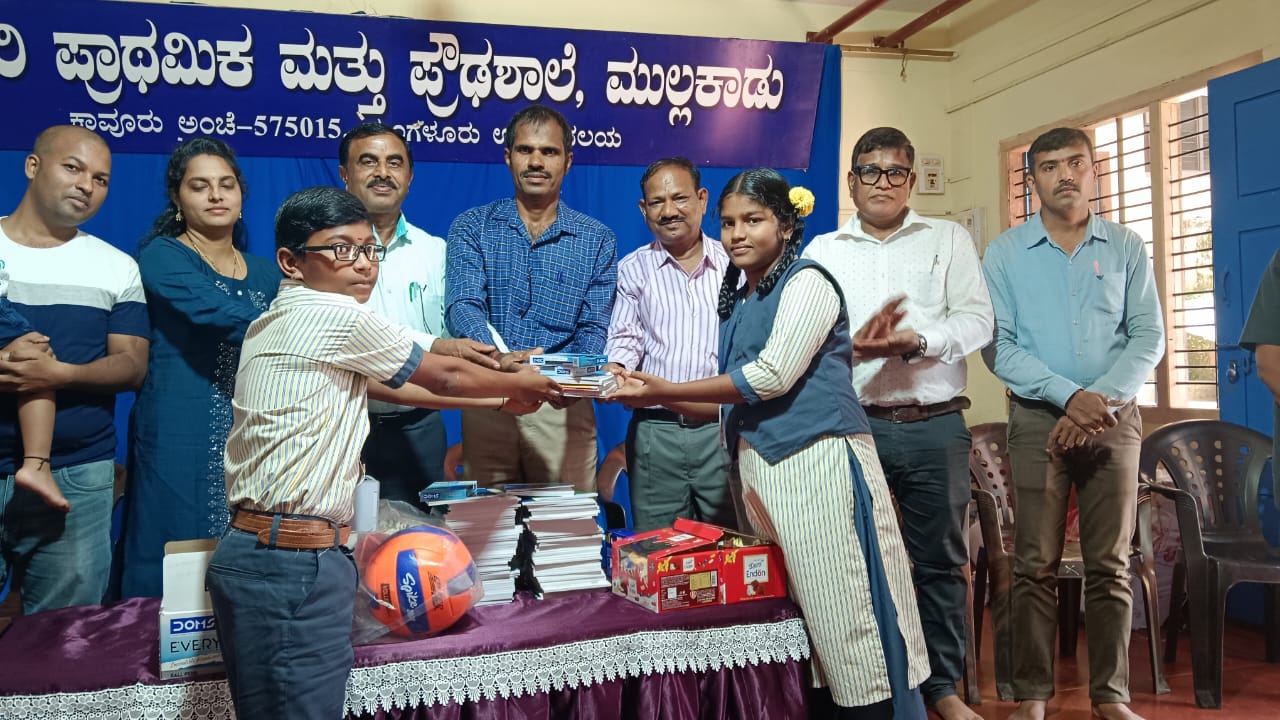 Mangaluru: Government Primary and High School, Mullakadu, organized a special program to distribute notebooks, stationery, and sports materials to the students. The initiative was made possible through the generous support of philanthropist Mr. Madhavan Sridharan, who sponsored the notebooks, and Mr. Chidananda, who contributed sports equipment.