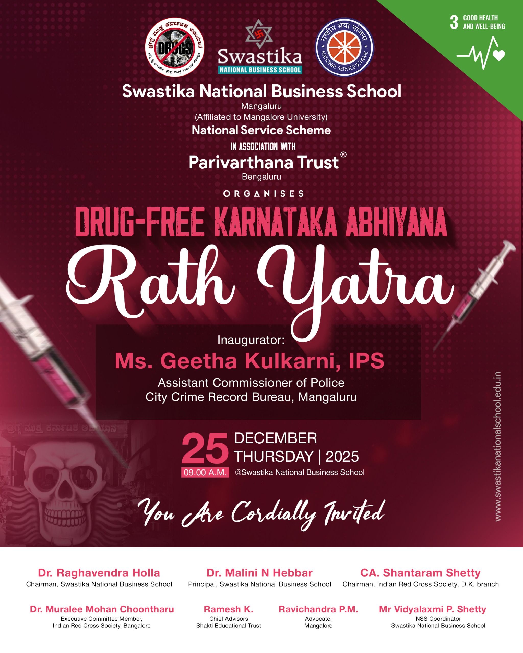 ಡಿಸೆಂಬರ್ 25ರಂದು ಸ್ವಸ್ತಿಕ ನ್ಯಾಷನಲ್ ಬಿಸಿನೆಸ್ ಸ್ಕೂಲ್ನಲ್ಲಿ ನಡೆಯುವ ಉದ್ಘಾಟನಾ ಕಾರ್ಯಕ್ರಮದಲ್ಲಿ ಶ್ರೀಮತಿ ಗೀತಾ ಕುಲಕರ್ಣಿ, ಐಪಿಎಸ್, ಸಹಾಯಕ ಪೊಲೀಸ್ ಆಯುಕ್ತರು (ಸಿಟಿ ಕ್ರೈಂ ರೆಕಾರ್ಡ್ ಬ್ಯೂರೋ), ಮಂಗಳೂರು, ಉದ್ಘಾಟಕರಾಗಿರಲಿದ್ದಾರೆ. ಕಾರ್ಯಕ್ರಮದಲ್ಲಿ ಡಾ. ರಾಘವೇಂದ್ರ ಹೊಳ್ಳ, ಅಧ್ಯಕ್ಷರು – ಸ್ವಸ್ತಿಕ ನ್ಯಾಷನಲ್ ಬಿಸಿನೆಸ್ ಸ್ಕೂಲ್; ಡಾ. ಮಳಿನಿ ಎನ್ ಹೆಬ್ಬಾರ್, ಪ್ರಾಂಶುಪಾಲರು; ಸಿಎ. ಶಾಂತರಾಮ್ ಶೆಟ್ಟಿ, ಅಧ್ಯಕ್ಷರು – ಭಾರತೀಯ ರೆಡ್ ಕ್ರಾಸ್ ಸಂಸ್ಥೆ, ದ.ಕ. ಶಾಖೆ; ಡಾ. ಮುರಳಿ ಮೋಹನ್ ಚೂಂತಾರು, ಕಾರ್ಯಕಾರಿ ಸಮಿತಿ ಸದಸ್ಯರು – ಭಾರತೀಯ ರೆಡ್ ಕ್ರಾಸ್ ಸಂಸ್ಥೆ, ಬೆಂಗಳೂರು; ರಮೇಶ್ ಕೆ., ಪ್ರಧಾನ ಸಲಹೆಗಾರರು – ಶಕ್ತಿ ಎಜುಕೇಷನಲ್ ಟ್ರಸ್ಟ್; ರವಿಚಂದ್ರ ಪಿ.ಎಮ್., ವಕೀಲರು, ಮಂಗಳೂರು ಹಾಗೂ ವಿದ್ಯಾಲಕ್ಷ್ಮಿ ಪಿ. ಶೆಟ್ಟಿ, NSS ಸಂಯೋಜಕರು ಉಪಸ್ಥಿತರಿರಲಿದ್ದಾರೆ.