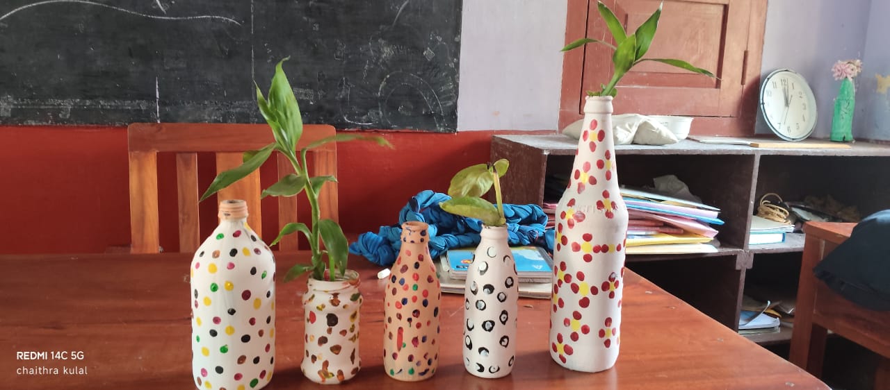 Students then took part in various eco-friendly craft activities with great enthusiasm. They created vases using waste bottles, flowers using pista shells, and tried weaving using old sarees. These activities encouraged them to think creatively and showed them how simple materials can be transformed into beautiful and useful crafts.