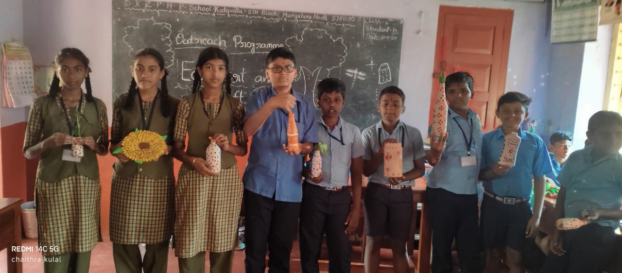 The programme was successfully organised by Chaitra (II B.Com), Kavya (II B.Com), Bhavisha (II B.Com), and Modakshi (II B.Com) under their community engagement project. Their efforts made the event educational, interactive, and memorable, leaving the students inspired to adopt eco-friendly practices in their daily lives.