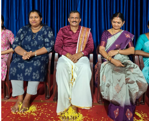 The ceremony began with a traditional invocation, where students offered prayers to honor their mentors. Mrs. Vidyalaxmi Shetty delivered the opening remarks, setting the tone for the occasion. This was followed by a presidential address by Dr. Raghavendra Holla, who reflected on the enduring importance of the Guru-Shishya tradition.