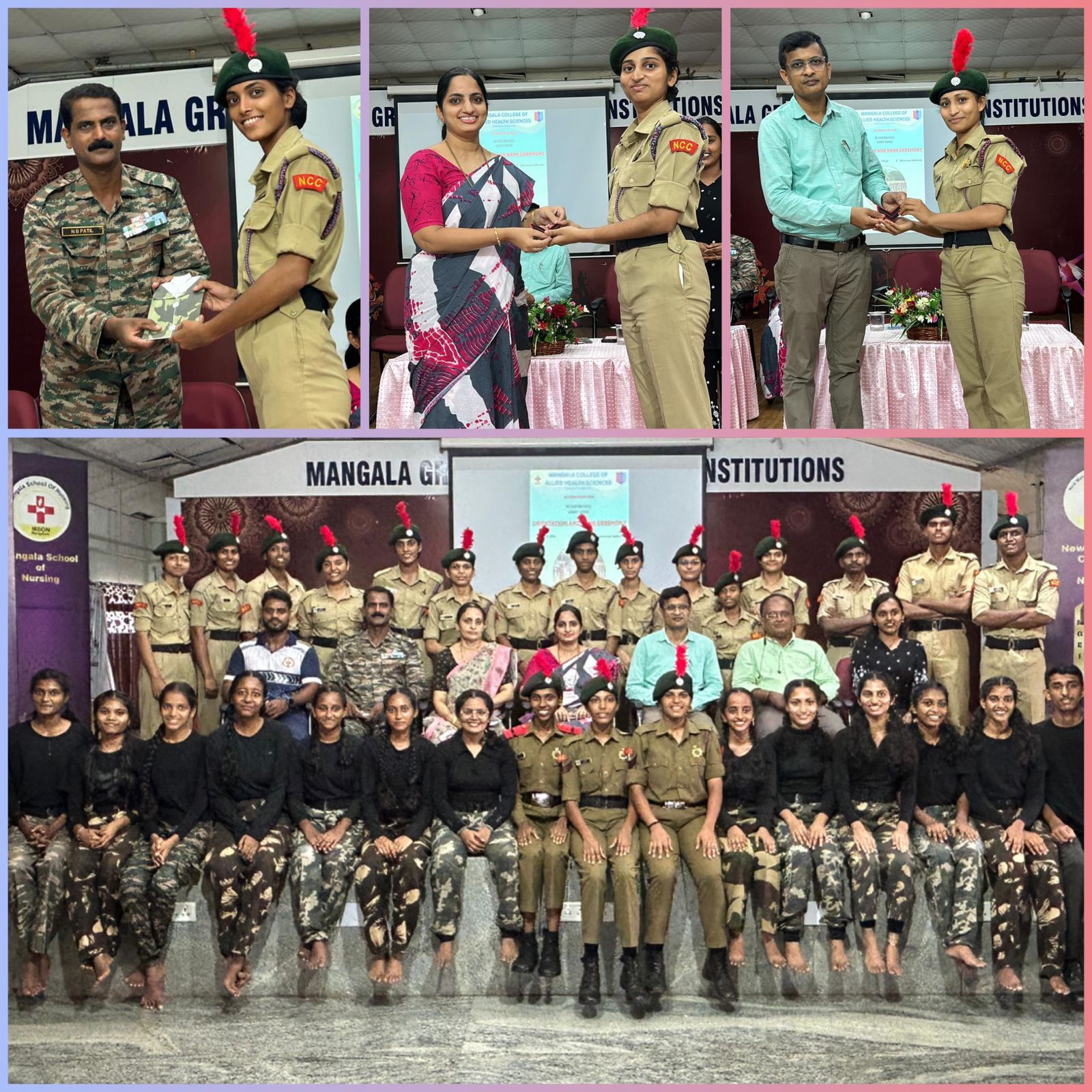 An inspiring speech by Naib Subedar N. B. Patil emphasized discipline and patriotism. Motivational speeches by Prof. Subramanya Nayak Principal, NMCON & MSON and Prof. Pratijna Suhasini G. R. Principal, MCAHS & MCPMS encouraged leadership and active NCC participation. The event was graced by Prof. Geethalakshmi Vice Principal, MCAHS & MCPMS, Dr. Dharmaraj Admission Officer, Mangala Group of Educational Institutions and senior staff members.