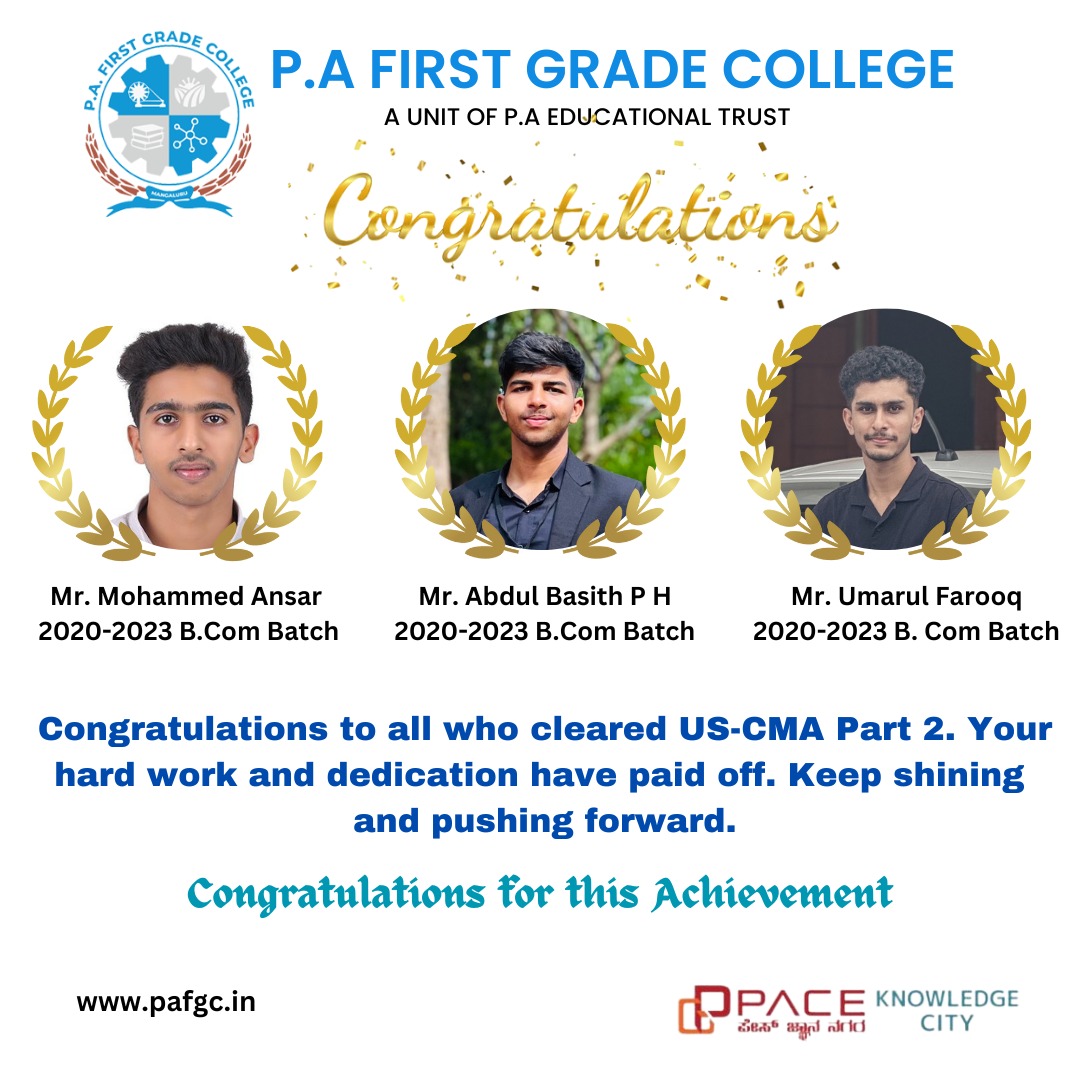 Mangalore, August 14, 2024 : P.A First Grade College is proud to announce that three students from the 2020-23 B.Com batch have successfully cleared the US-CMA (United States Certified Management Accountant) Part-2 examination. Mr. Mohammed Ansar, Mr. Abdul Basith P.H, and Mr. Umarul Farooq have demonstrated exceptional dedication and hard work, reflecting the quality education provided by the institution.