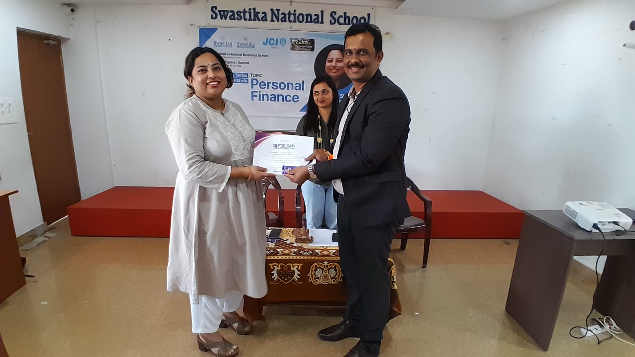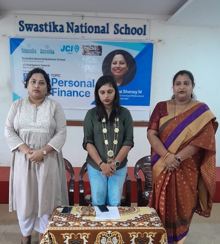 Mangalore August 28, 2024 : Swastika National Business School, in collaboration with JCI Mangaluru Samrat, hosted a highly informative session on “Personal Finance” as part of its ongoing weekly series, UdyamShala, at 10:00 AM on the school premises.