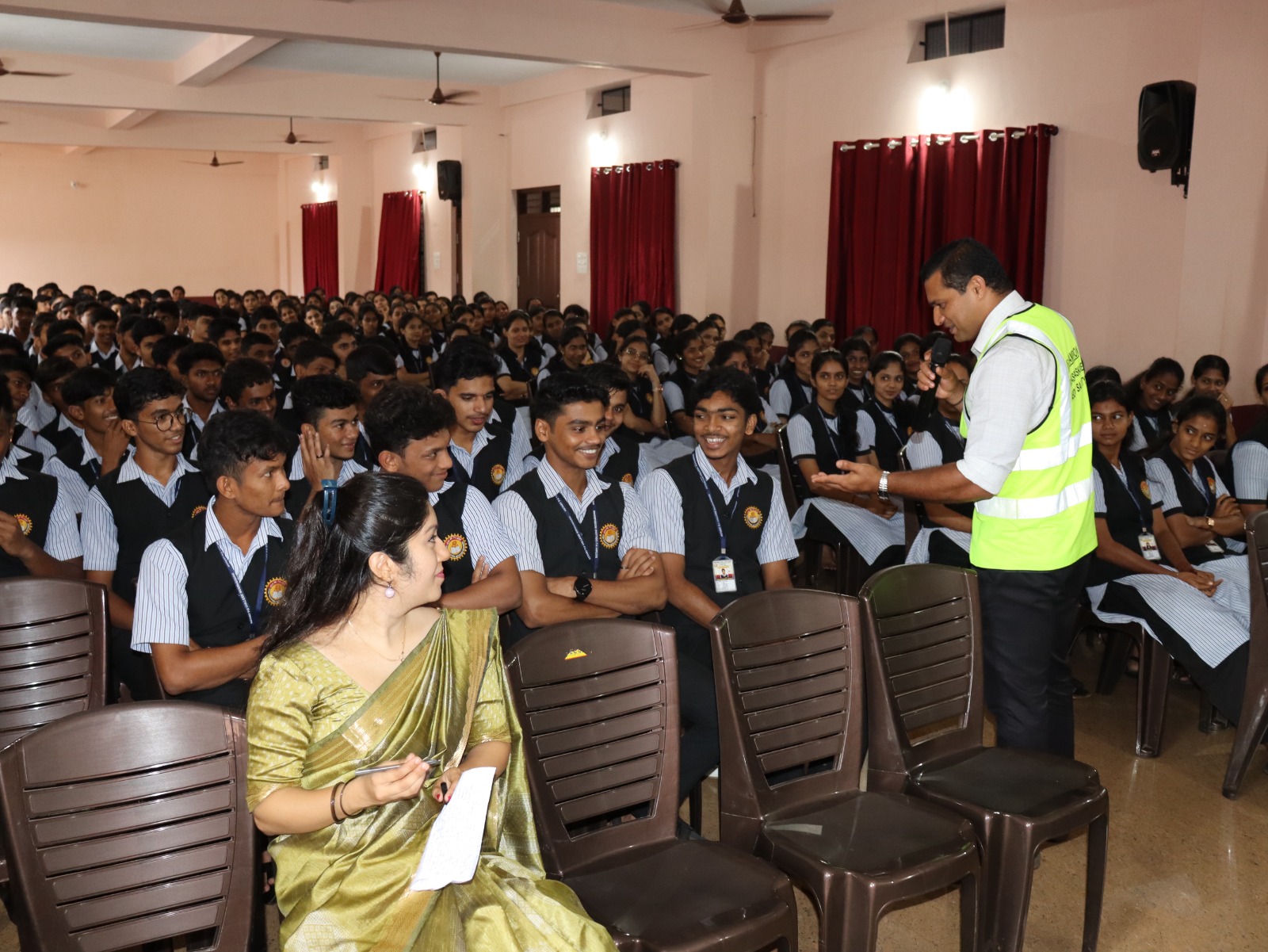 The program aimed to educate students and staff about essential safety measures, emergency response techniques, and disaster management. Mr. Sathyaraj delivered a detailed and interactive presentation covering key topics such as fire prevention, safe evacuation procedures, first aid basics, and handling fire-fighting equipment.
