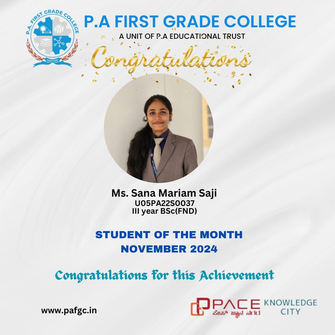 Sana Mariam Saji from 3rd FND won the title of *Student of the Month* for November 2024. The panel of judges included Mr. Mohammed Faizal N. (Head, CPOD), Dr. Surfraz J. Hasim (Principal), and Dr. G. Harikrishnan (Vice Principal).The program was coordinated by Ms. Saniya M. and Ms. Krithika (Assistant Professors, Dept. of Food Sciences), Ms. Sunitha (Assistant Professor, Dept. of HSS), Ms. Janani (Dept. of Computer Applications), and Ms. Reshma and Mr. Sajir Ahmed (Assistant Professors, Dept. of Commerce and Management).