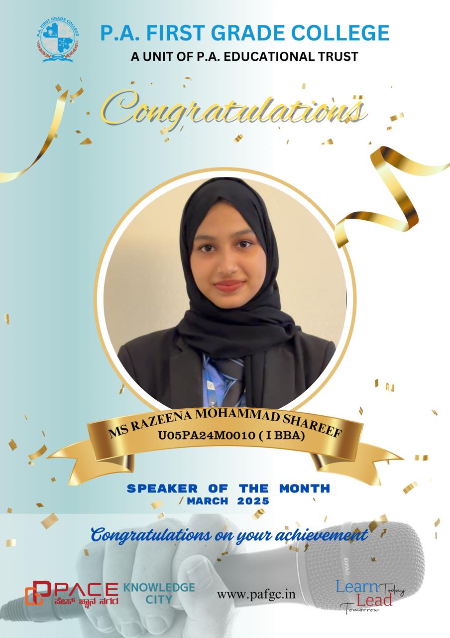 The Public Speaking Club of PA First Grade College conducted the Speaker of the Month (March) competition on 25th March 2025 in Seminar Hall 1.