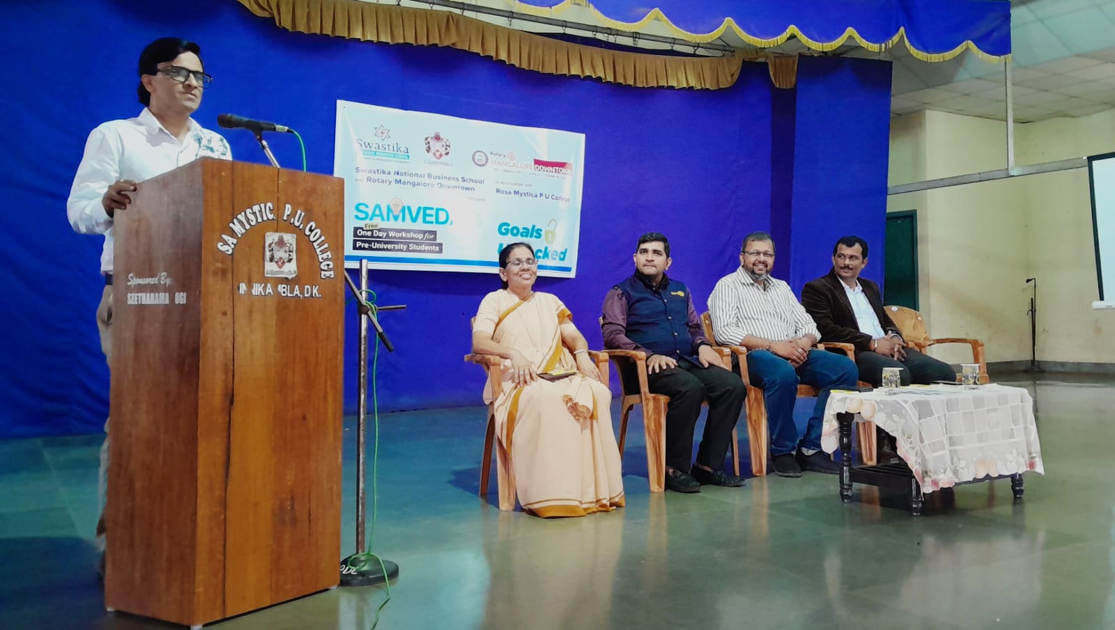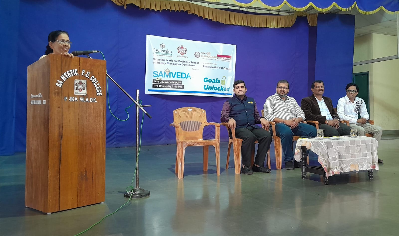 Kinnikambla, September 13, 2024 : Swastika National Business School, in collaboration with Rotary Mangalore Downtown and Rosa Mystica PU College, successfully conducted the one-day workshop ‘Samveda #17: Goals Unlocked’ at Rosa Mystica PU College, Kinnikambla, Mangalore. This initiative, aimed at guiding pre-university students in unlocking their potential and achieving personal and academic goals, received enthusiastic participation from the attendees.