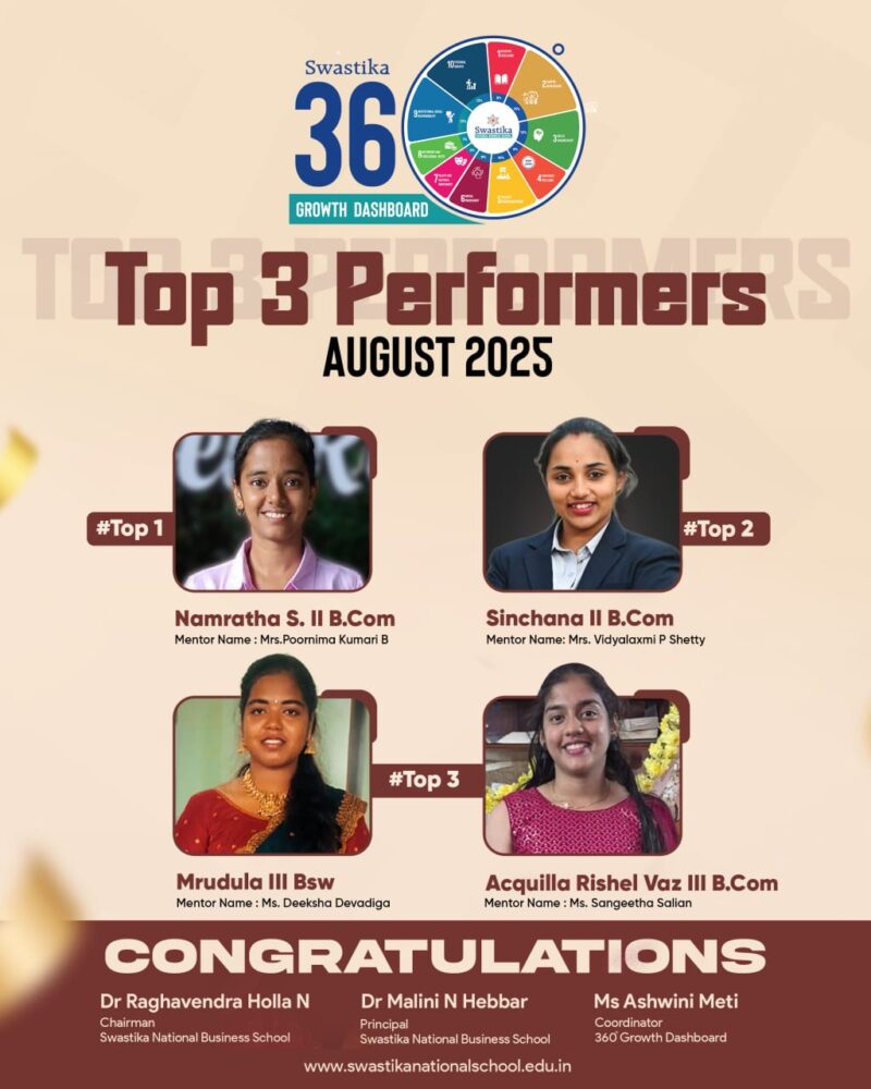 Mangaluru, 7 September 2025: Swastika National Business School proudly celebrated the outstanding achievements of its students by announcing the Top 3 Performers for the month of August 2025 under the Swastika 360° Growth Dashboard, a unique model that tracks holistic student development across academics, skills, and overall growth.