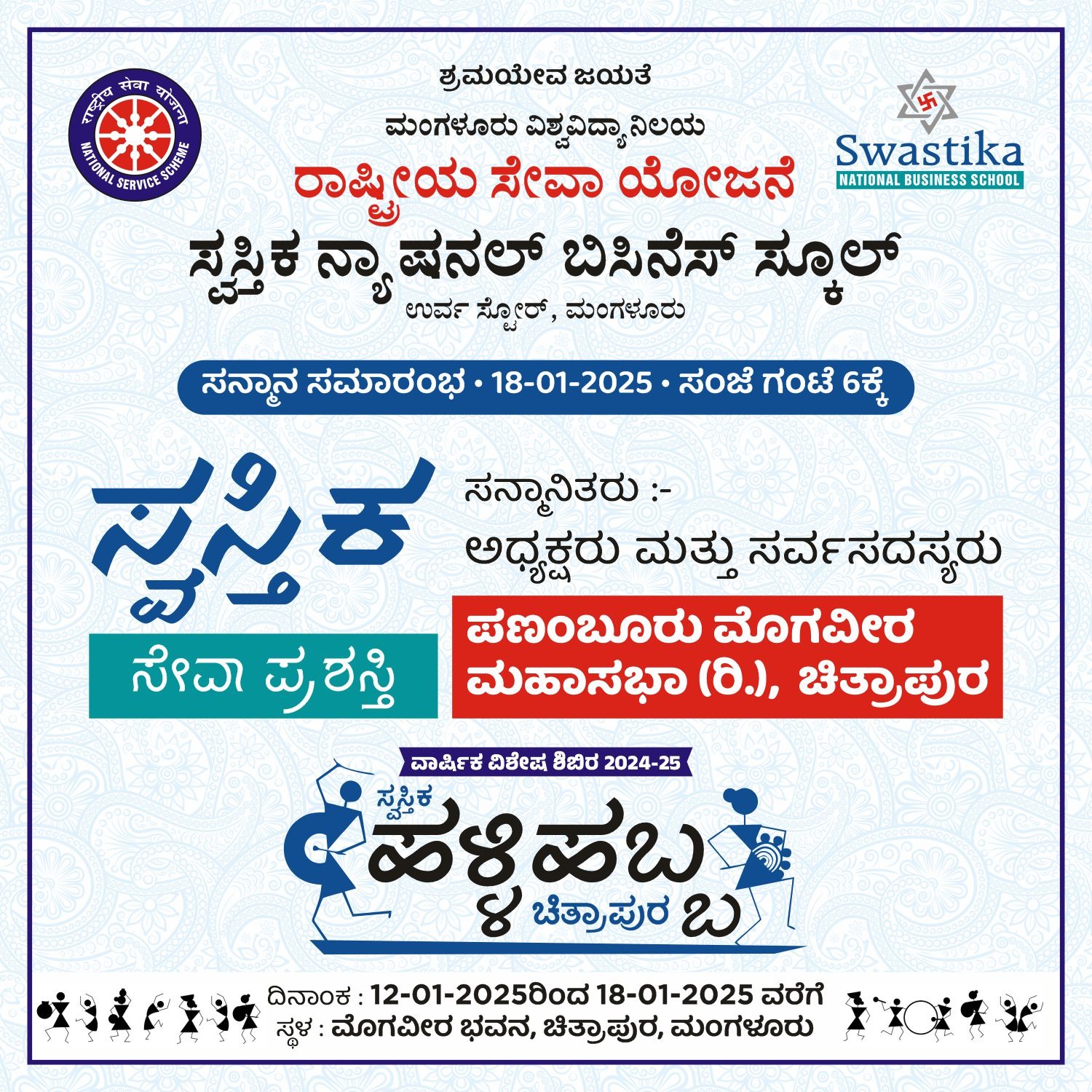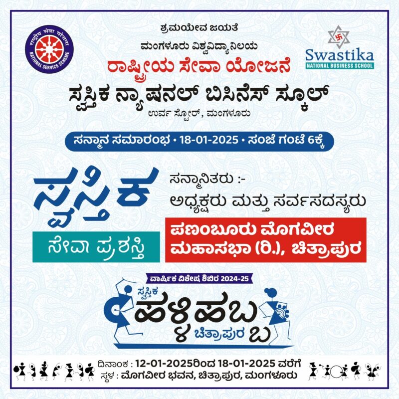 ಚಿತ್ರಾಪುರ, 18 ಜನವರಿ 2024: ಸ್ವಸ್ತಿಕ ನ್ಯಾಷನಲ್ ಬಿಸಿನೆಸ್ ಸ್ಕೂಲ್ ಇದರ ರಾಷ್ಟ್ರೀಯ ಸೇವಾ ಯೋಜನೆಯ ವಾರ್ಷಿಕ ವಿಶೇಷ ಶಿಬಿರವು ದಿನಾಂಕ 12 ರಿಂದ 18ರವರೆಗೆ ಚಿತ್ರಪುರದಲ್ಲಿ ನಡೆಯುತ್ತಿದೆ. ಇಲ್ಲಿಯ ಸುಮಾರು 400 ವರ್ಷ ಇತಿಹಾಸವುಳ್ಳ ಉತ್ತರದ ಪಣಂಬೂರಿನ ಬೋರ್ಮಾಡಿ ಗ್ರಾಮದಿಂದ ದಕ್ಷಿಣದ ಕುಲಾಯಿ ಚಿತ್ರಾಪುರಕ್ಕೆ 1964ರಲ್ಲಿ ಬಂದ, ಆರ್ಯ ಸಮಾಜದ ಪ್ರಭಾವಕ್ಕೆ ಒಳಗೊಂಡ ಮೊಗವೀರ ಸಂಘವು ಮೊಗವೀರ ಮಹಾಸಭಾ ಪಣಂಬೂರು, ಕುಳಾಯಿ ಎಂದು ಮರುನಾಮಾಂಕಿತಗೊಂಡು ತನ್ನನ್ನು ತಾನು ಜನಸೇವೆಗೆ ತೊಡಗಿಸಿಕೊಂಡಿದೆ.