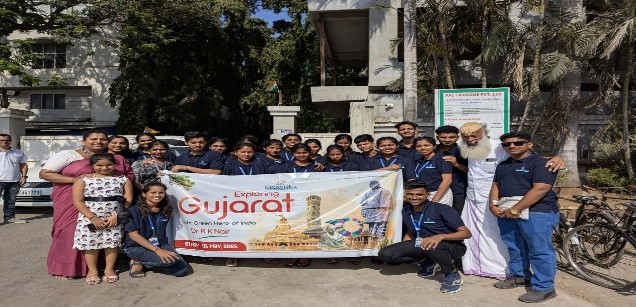 A group of enthusiastic students from Swastika National Business School recently returned from a meaningful and eye-opening three-day educational trip to Gujarat, guided by the vision and hospitality of renowned forest creator R.K. Nair. The visit was a result of an unexpected but wonderful opportunity—when Mr. Nair noticed our team at a press meet in the Mangaluru Press Club, he was impressed by our energy and invited us to witness his green initiatives in Gujarat.
