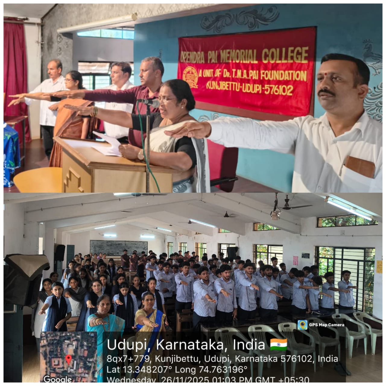 ಉಡುಪಿ, 26 ನವೆಂಬರ್ 2025: ಕುಂಜಿಬೆಟ್ಟು ಉಪೇಂದ್ರ ಪೈ ಮೆಮೋರಿಯಲ್ ಕಾಲೇಜಿನಲ್ಲಿ ನವೆಂಬರ್ 26ರಂದು ಜಗತ್ತಿನ ಅತಿದೊಡ್ಡ ಪ್ರಜಾಪ್ರಭುತ್ವ ರಾಷ್ಟ್ರವಾದ ಭಾರತಕ್ಕೆ ಸರ್ವಶ್ರೇಷ್ಠ ಸಂವಿಧಾನ ನೀಡಿದ ಎಲ್ಲರನ್ನು ಸ್ಮರಿಸಲು ‘ಸಂವಿಧಾನ ದಿನ’ ಆಚರಿಸಲಾಯಿತು.