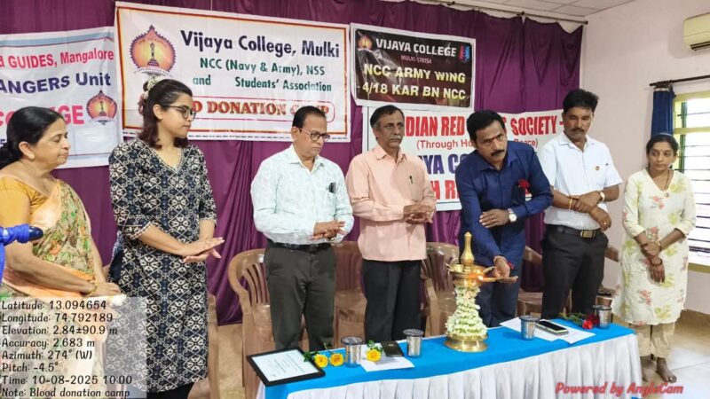 ಮುಲ್ಕಿ, 8 ಅಕ್ಟೋಬರ್ 2025: ವಿಜಯ ಕಾಲೇಜು, ಮುಲ್ಕಿ, ರಾಷ್ಟ್ರೀಯ ಸೇವಾ ಯೋಜನೆ ಘಟಕ, ರೆಡ್ ಕ್ರಾಸ್ ರೋವರ್ಸ್ ರೆಂಜರ್ಸ್, ಎನ್ ಸಿ ಸಿ ಇದರ ಆಶ್ರಯದಲ್ಲಿ ಹಾಗೂ ಲೈನ್ಸ್ ಕ್ಲಬ್ ಬಪ್ಪನಾಡು ಇನ್ಸ್ಪಾಯರ್ ಮತ್ತು ಕೆಎಂಸಿ ಆಸ್ಪತ್ರೆ ಅತ್ತಾವರ ಇವರ ಸಹಕಾರದೊಂದಿಗೆ ರಕ್ತದಾನ ಶಿಬಿರವನ್ನು ವಿಜಯ ಕಾಲೇಜು, ಮೂಲ್ಕಿಯಲ್ಲಿ ಹಮ್ಮಿಕೊಳ್ಳಲಾಯಿತು.