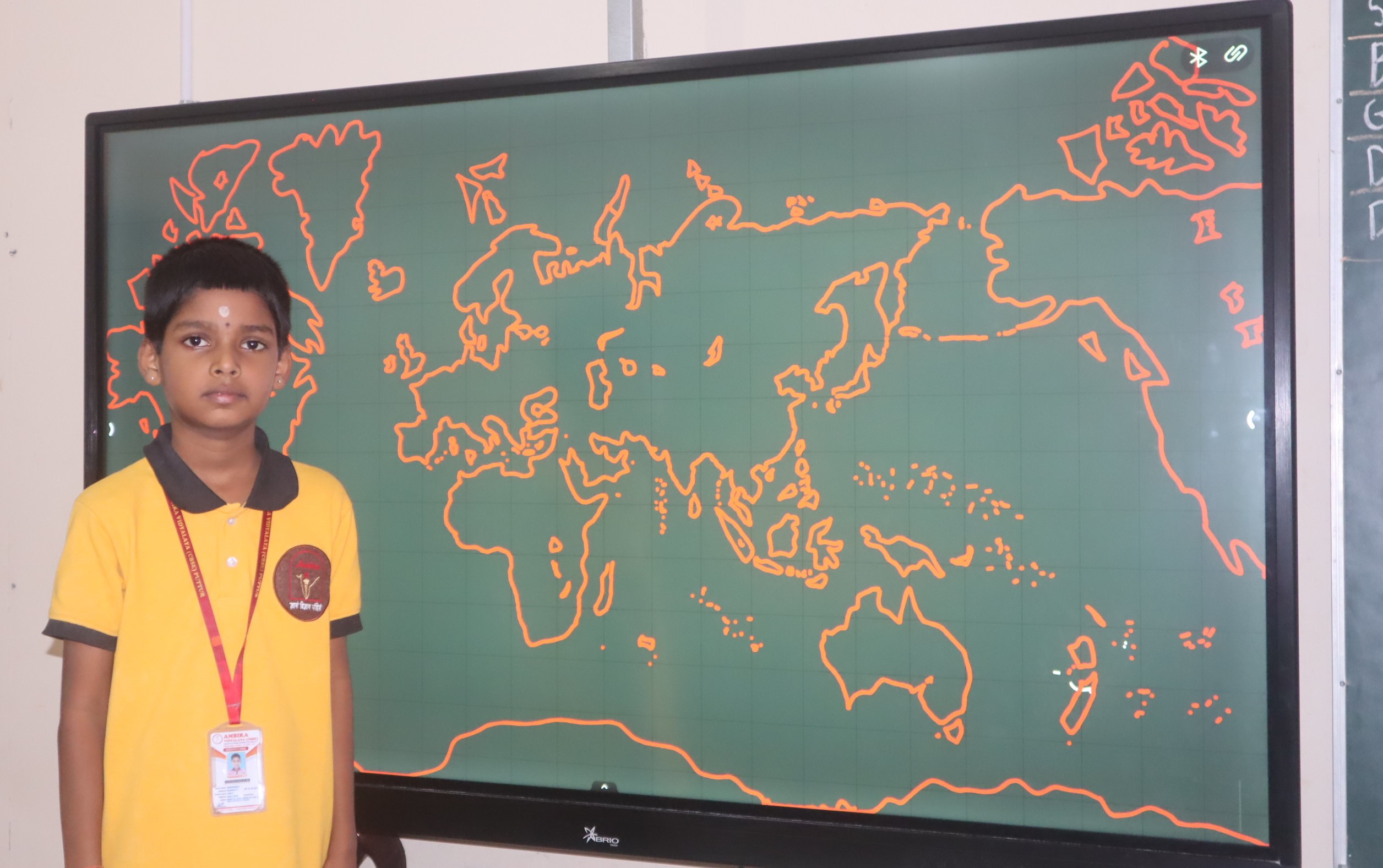 ಆದರೆ ಇಲ್ಲೊಬ್ಬ ವಿದ್ಯಾರ್ಥಿ ಇದ್ದಾನೆ. ಈತ ಭಾರತದೊಂದಿಗೆ ಸ್ಥಳೀಯ ರಾಷ್ಟ್ರಗಳನ್ನೂ ಚಿತ್ರಿಸುತ್ತಾನೆ. ನೀವಿನ್ನೂ ನೋಡುತ್ತಲೇ ಇದ್ದರೆ ಮತ್ತೂ ಚಿತ್ರಿಸುತ್ತಾ ಸಾಗುತ್ತಾನೆ. ಅಂತಿಮವಾಗಿ ಇಡಿಯ ಪ್ರಪಂಚವನ್ನೇ ನಿಮ್ಮ ಕಣ್ಣ ಮುಂದೆ ಅರಳಿಸಿಬಿಡುತ್ತಾನೆ! ಹೌದು ಪ್ರಪಂಚದ ನೂರ ತೊಂಬತ್ತೊಂದು ದೇಶಗಳನ್ನೂ ಈ ವಿದ್ಯಾರ್ಥಿ ಆಯಾ ಜಾಗದಲ್ಲೇ ಚಿತ್ರಿಸಿ ತೋರಿಸುತ್ತಾನೆ! ಜತೆಗೆ ಭಾರತದ ಭೂಪಟದೊಂದಿಗೆ ಆಯಾ ರಾಜ್ಯಗಳನ್ನೂ ಗುರುತಿಸಿ ಚಿತ್ರಿಸುತ್ತಾನೆ. ಒಮ್ಮೆ ಚಿತ್ರಿಸಲು ಆರಂಭಿಸಿದರೆ ತಿದ್ದದೇ ಕೊನೆಯವರೆಗೂ ಮುಂದುವರೆಯುತ್ತಾನೆಂಬುದು ಸೋಜಿಗ ತರುವ ವಿಚಾರ.
