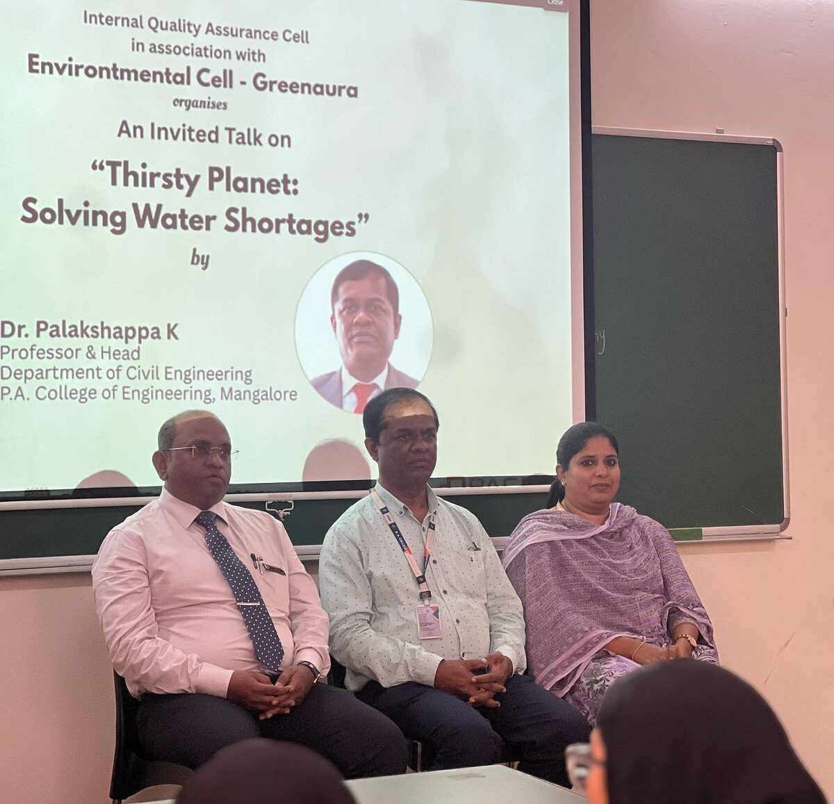 Mangalore, 7 April 2025: Nature club – Greenaura, in collaboration with IQAC, organized an invited talk on “Thirsty Planet: Solving Water Shortages” on the occasion of World Water Day. The event featured Dr. Palakshappa K, Professor & Head, Department of Civil Engineering, P.A. College of Engineering, Mangalore, as the keynote speaker.